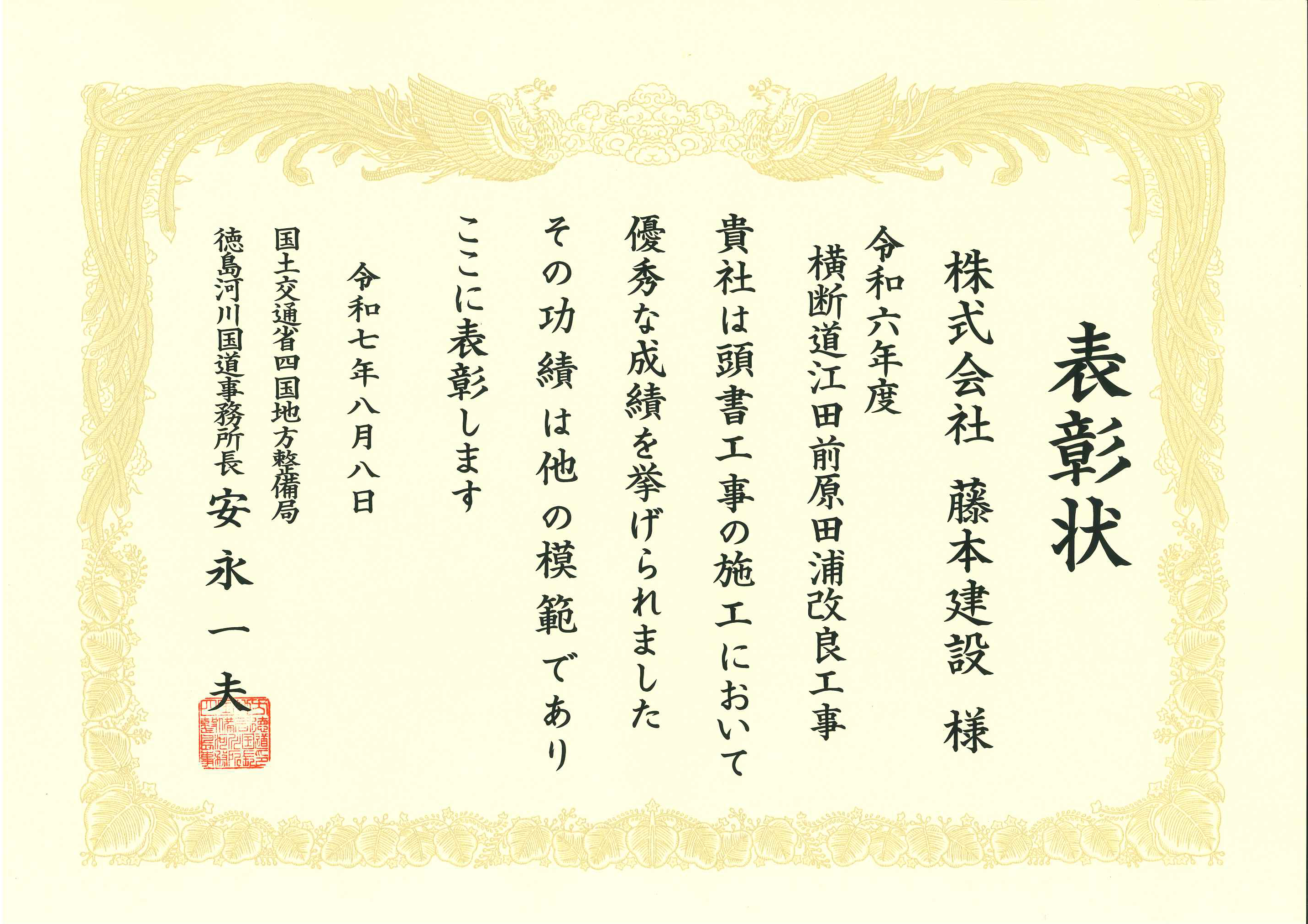 国交省より工事成績優秀企業に認定されました。