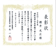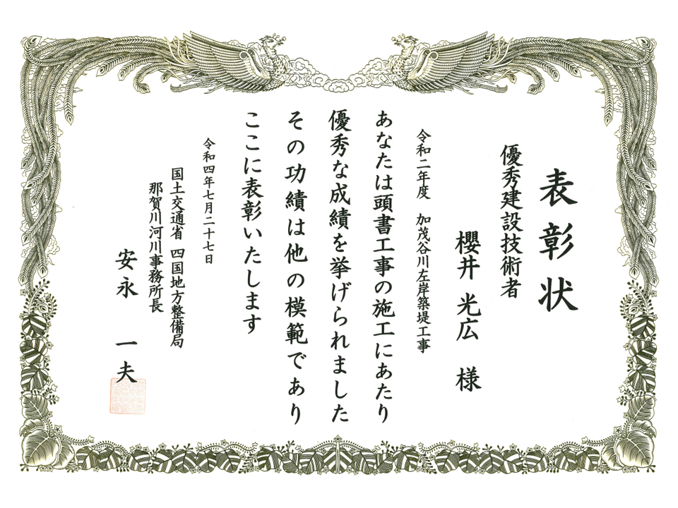 工事部 櫻井現場代理人が四国地方整備局部長等表彰 優秀建設技術者(工事)を受賞しました。