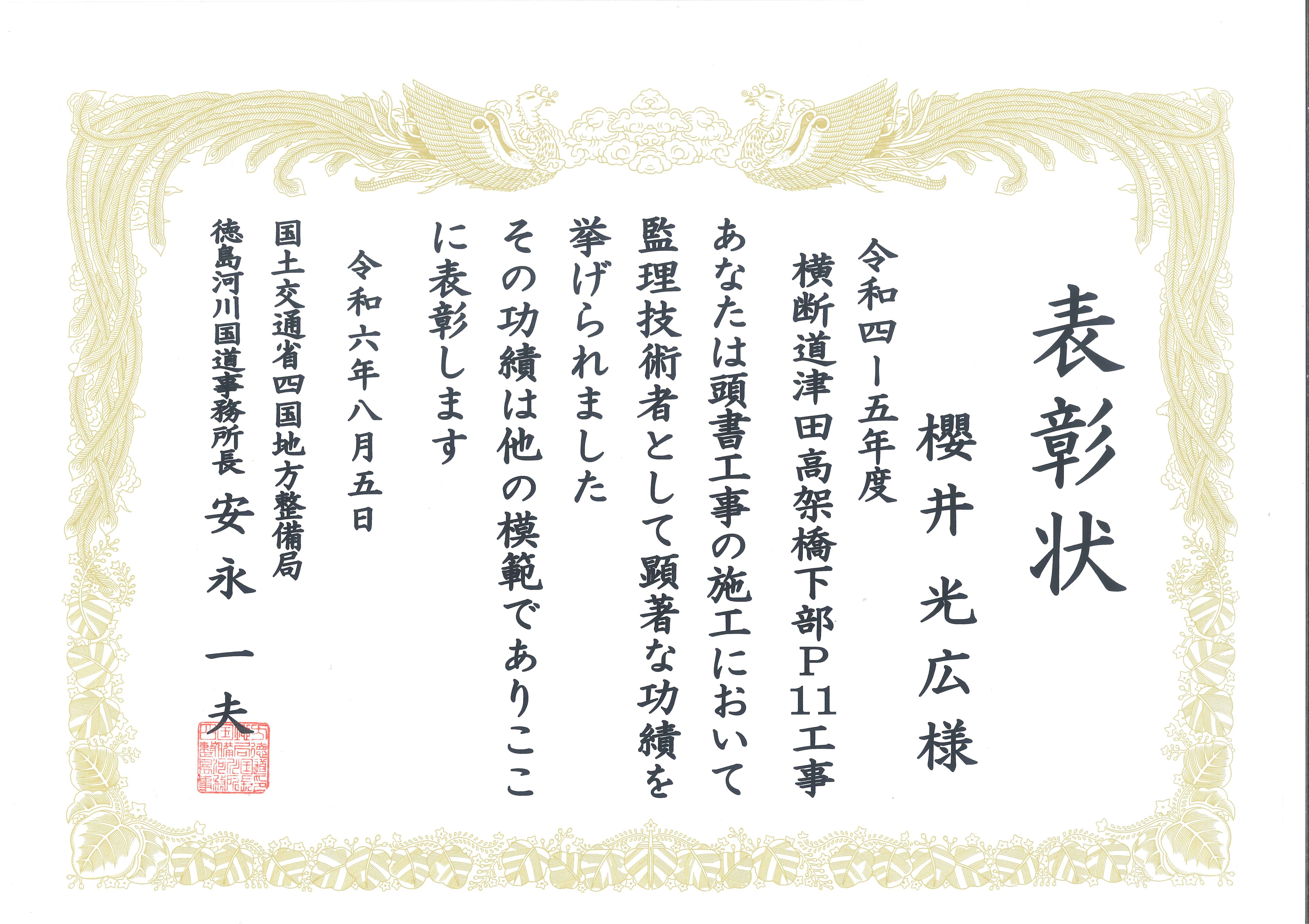 工事部 櫻井現場代理人が国土交通省 四国地方整備局部長等表彰 優秀建設技術者(工事)を受賞しました。