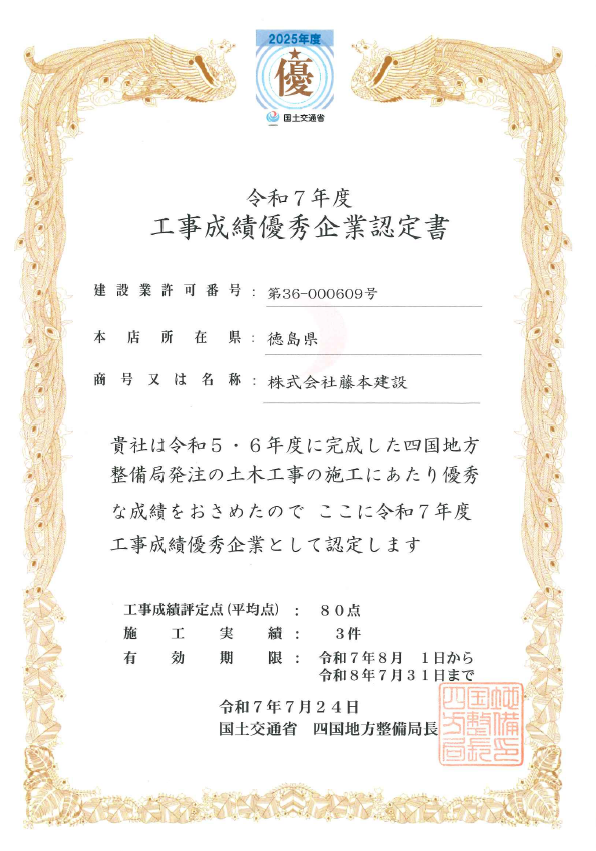 国交省より工事成績優秀企業に認定されました。